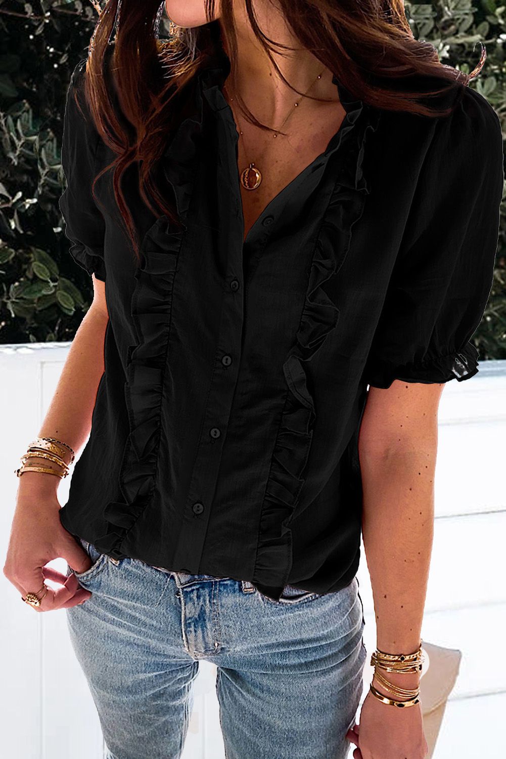 The shirt with the solid color and ruffled design is elegant and fashionable