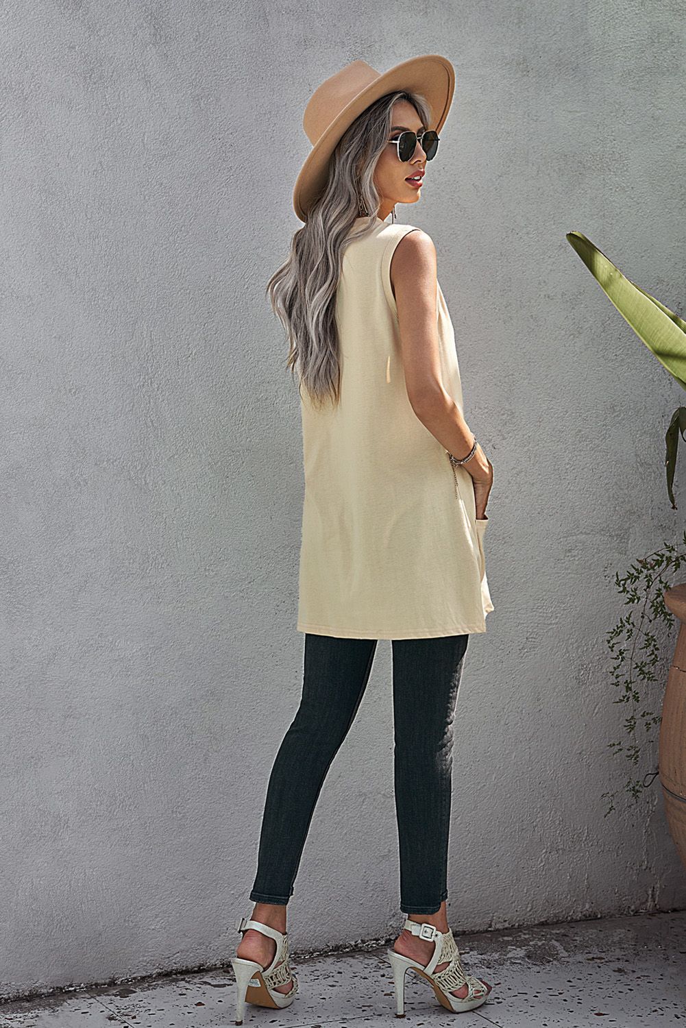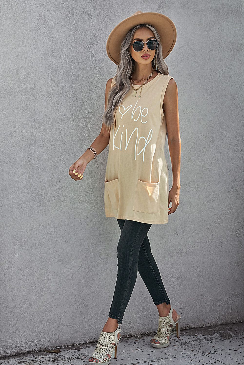 Solid color tank, chic letters graphic on the front, tunic length with sided pockets