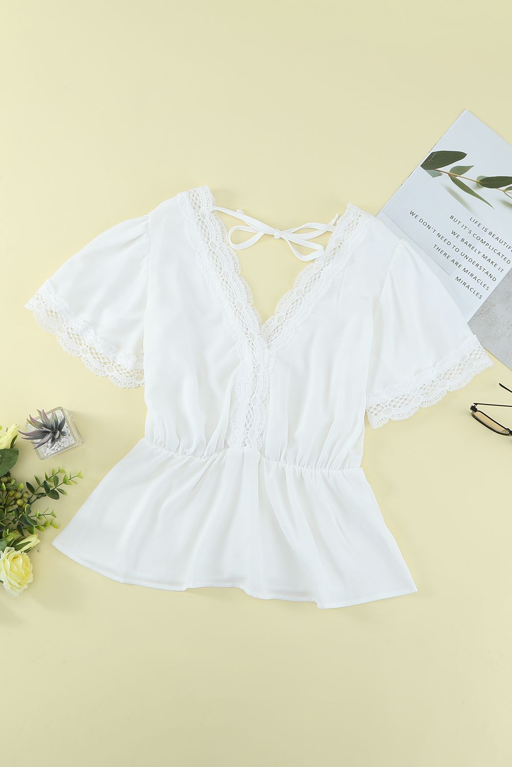 Apricot Lace Splicing V Neck Short Sleeve Blouse