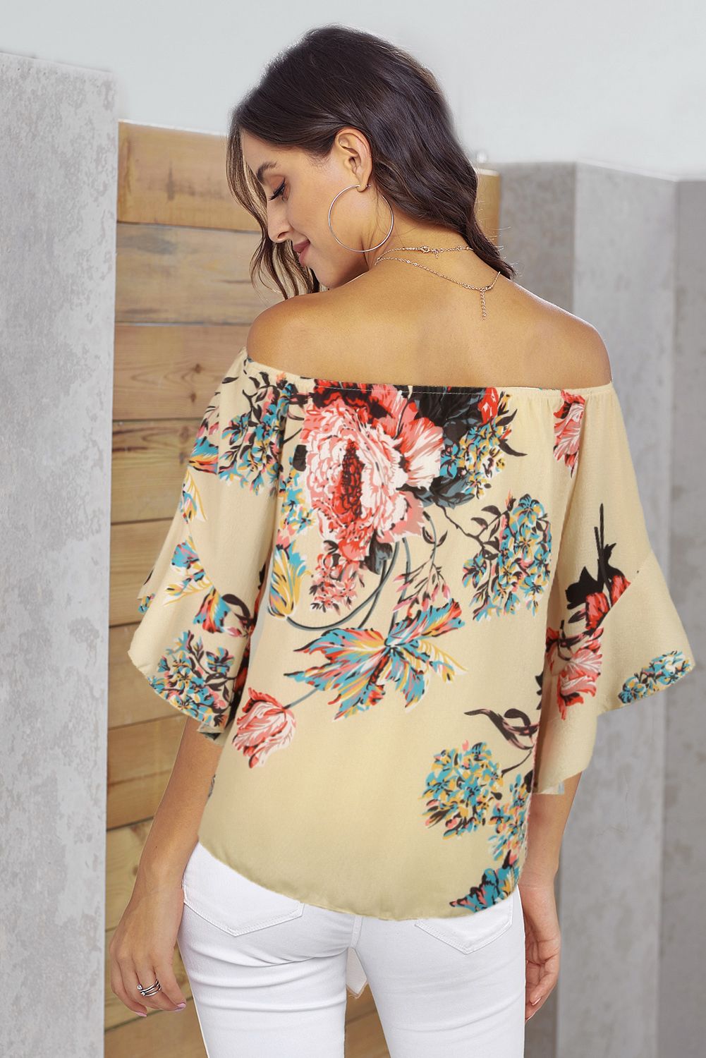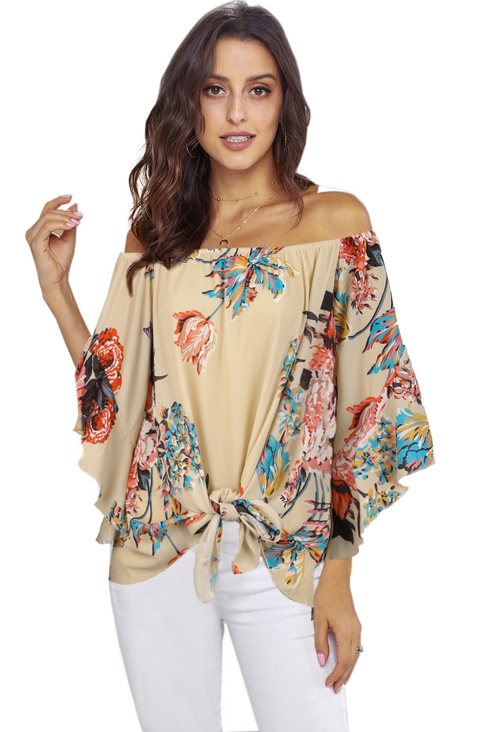 Apricot Off Shoulder Floral Tie Front High Low Chiffon Blouse