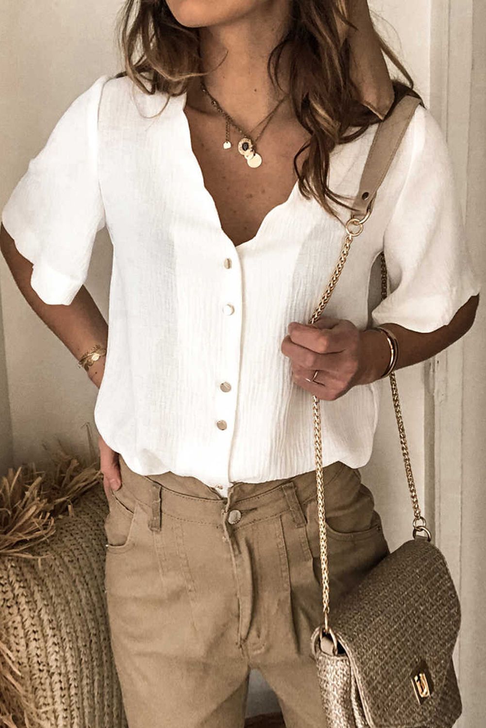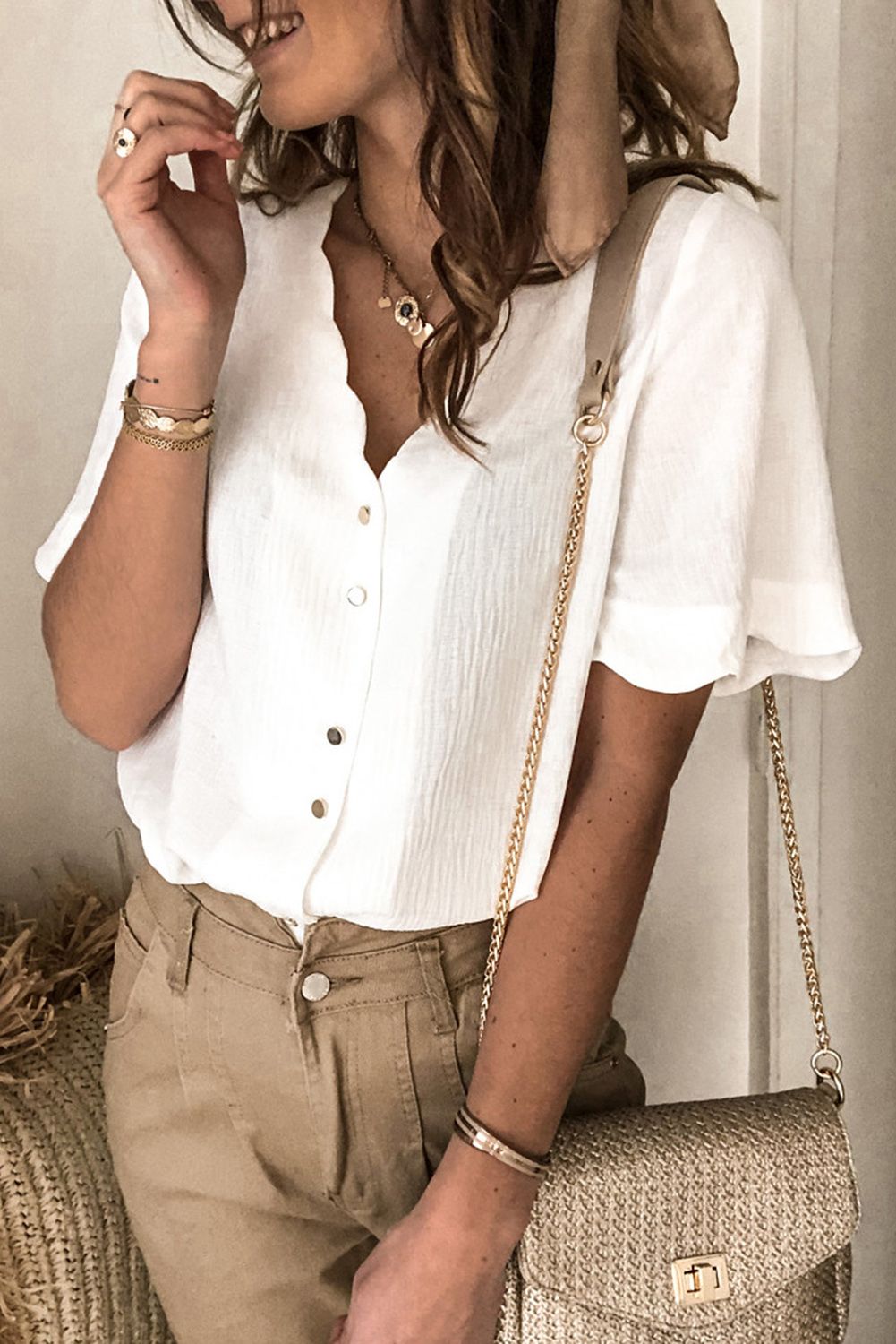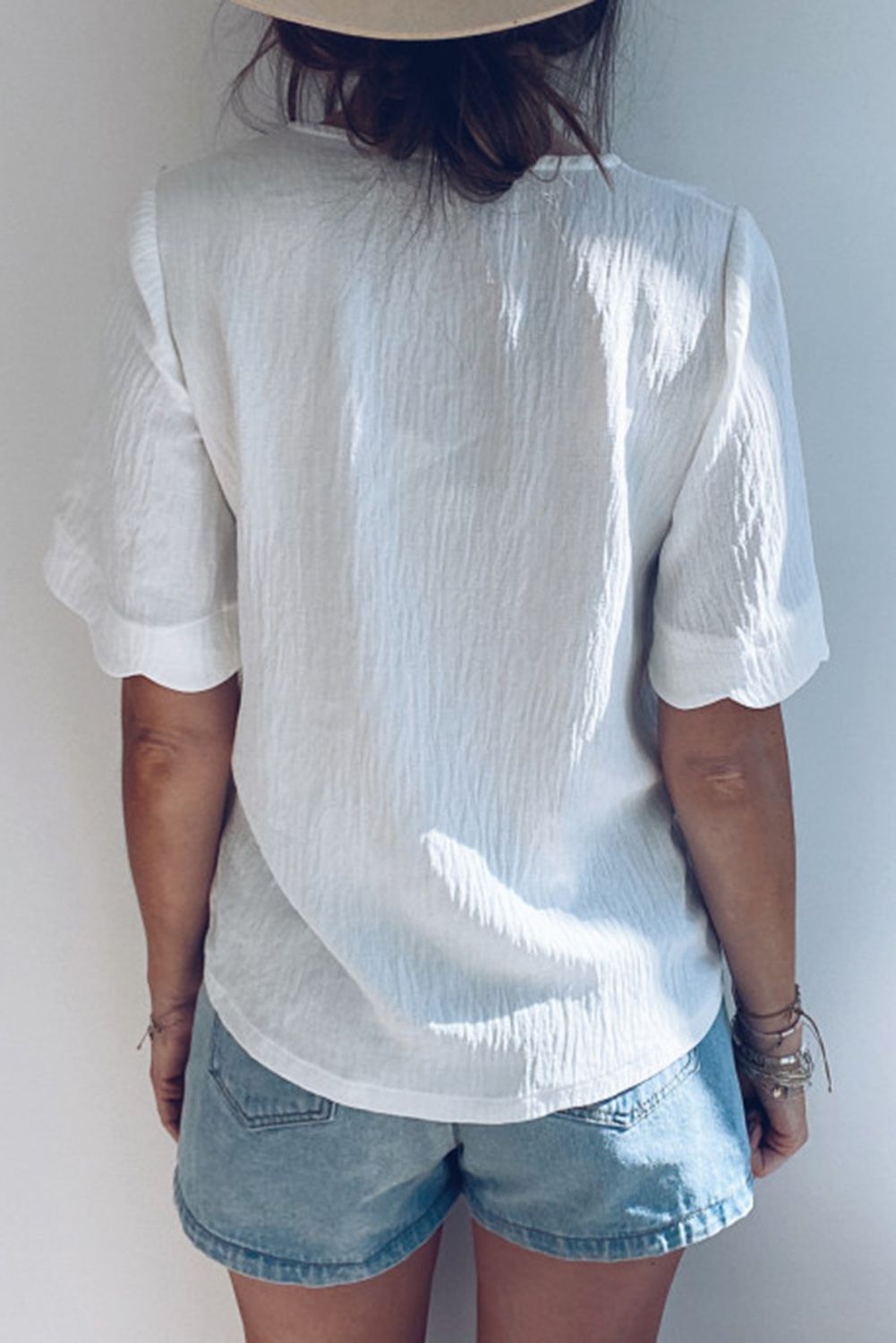 Scalloped Neckline Textured Short Sleeve Shirt