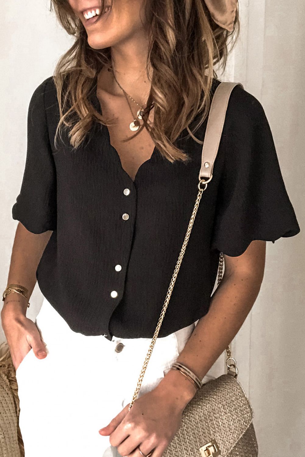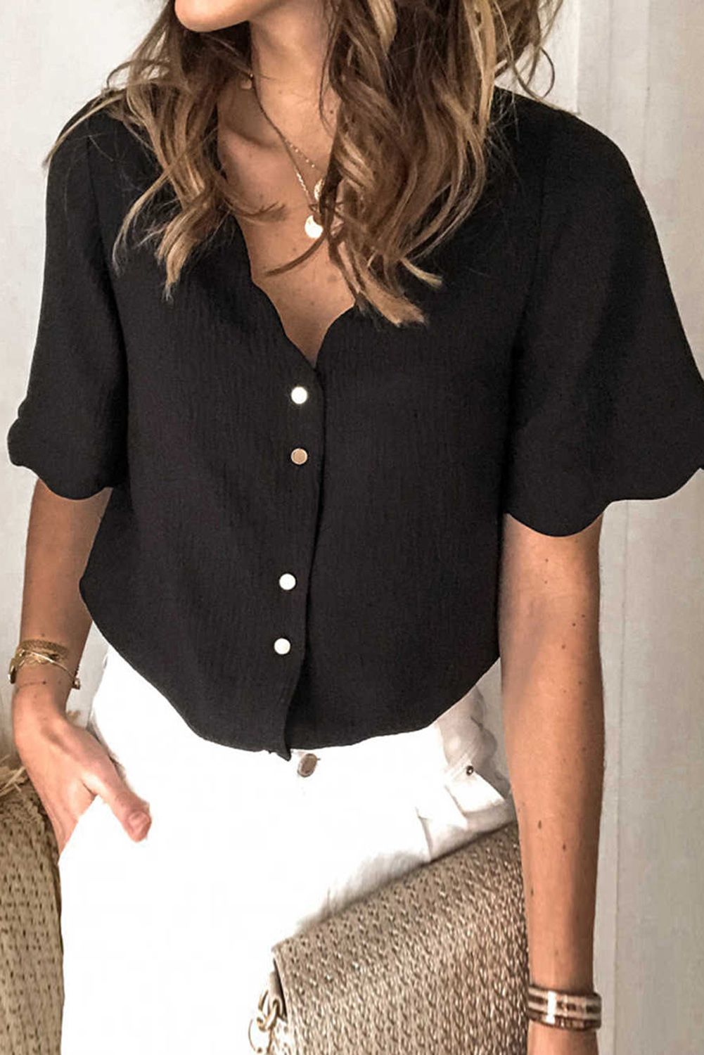 Black Scalloped Neckline Textured Short Sleeve Shirt