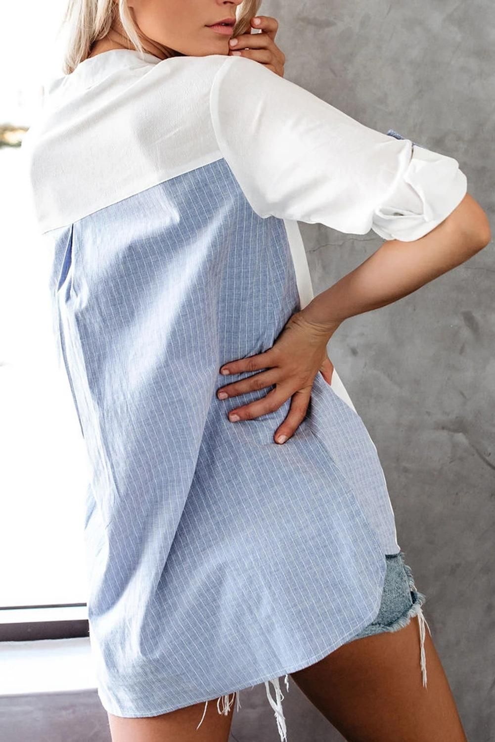 Rendered with a collared neckline, button up front and roll tab sleeves