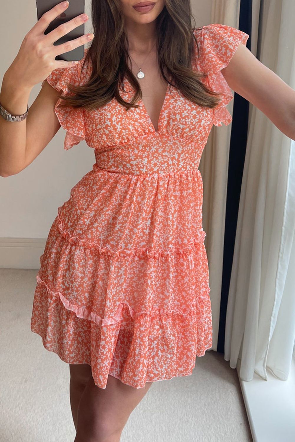 • Ditsy floralprint and rufflesmake this shortdress elegant and fashionable