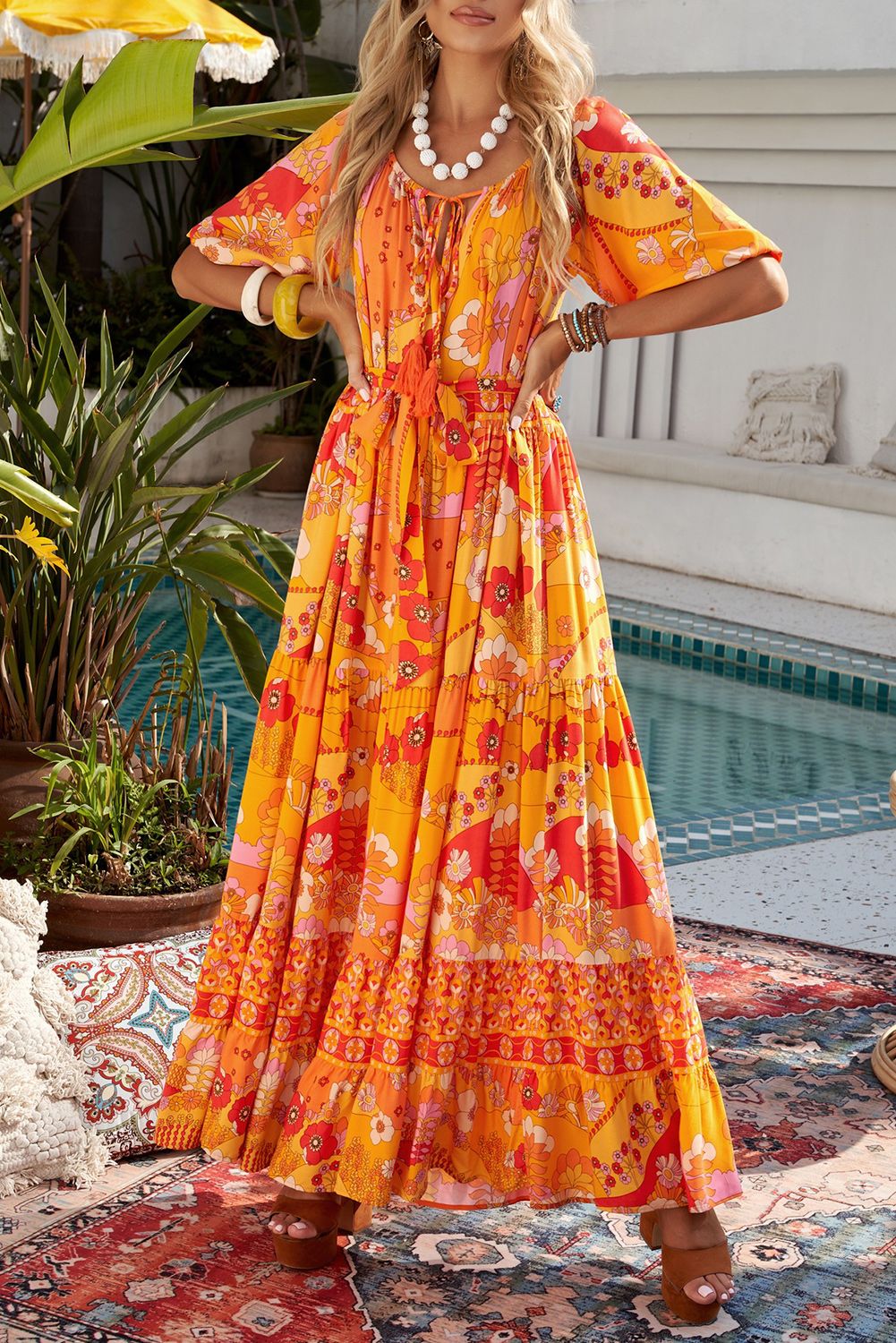 Orange Boho Empire Waist Floral Long Dress