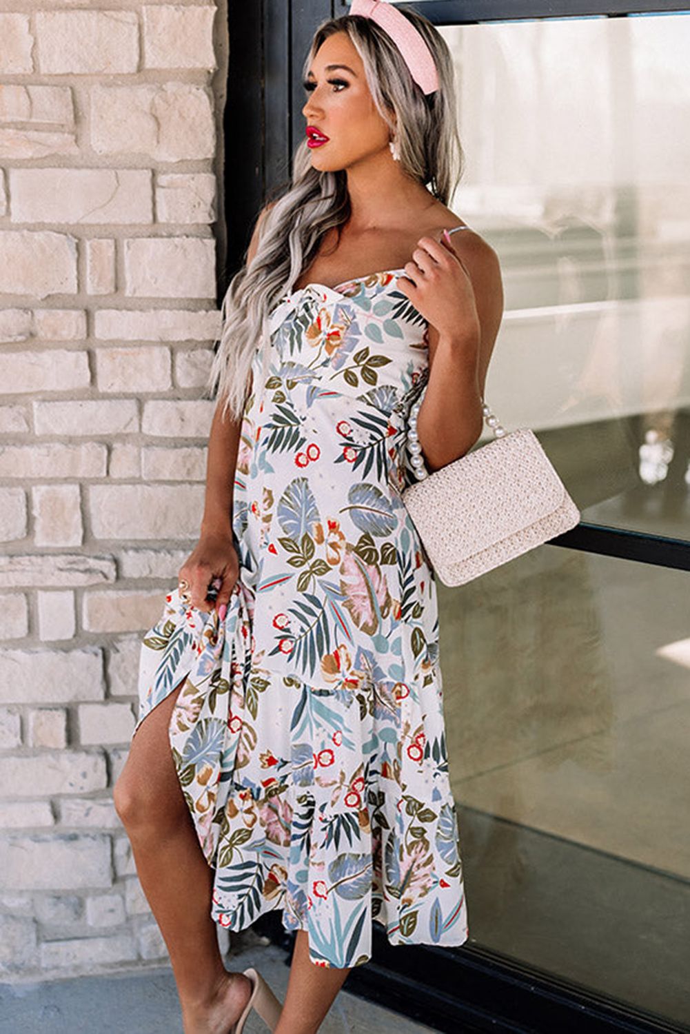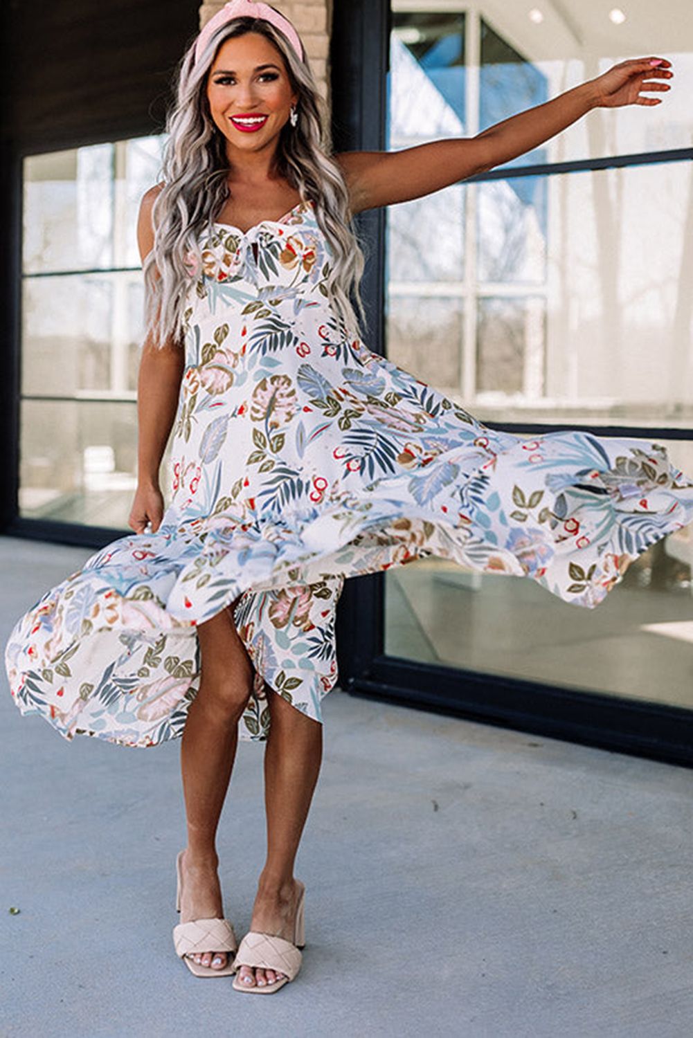 White Floral Knotted Spaghetti Straps Midi Dress