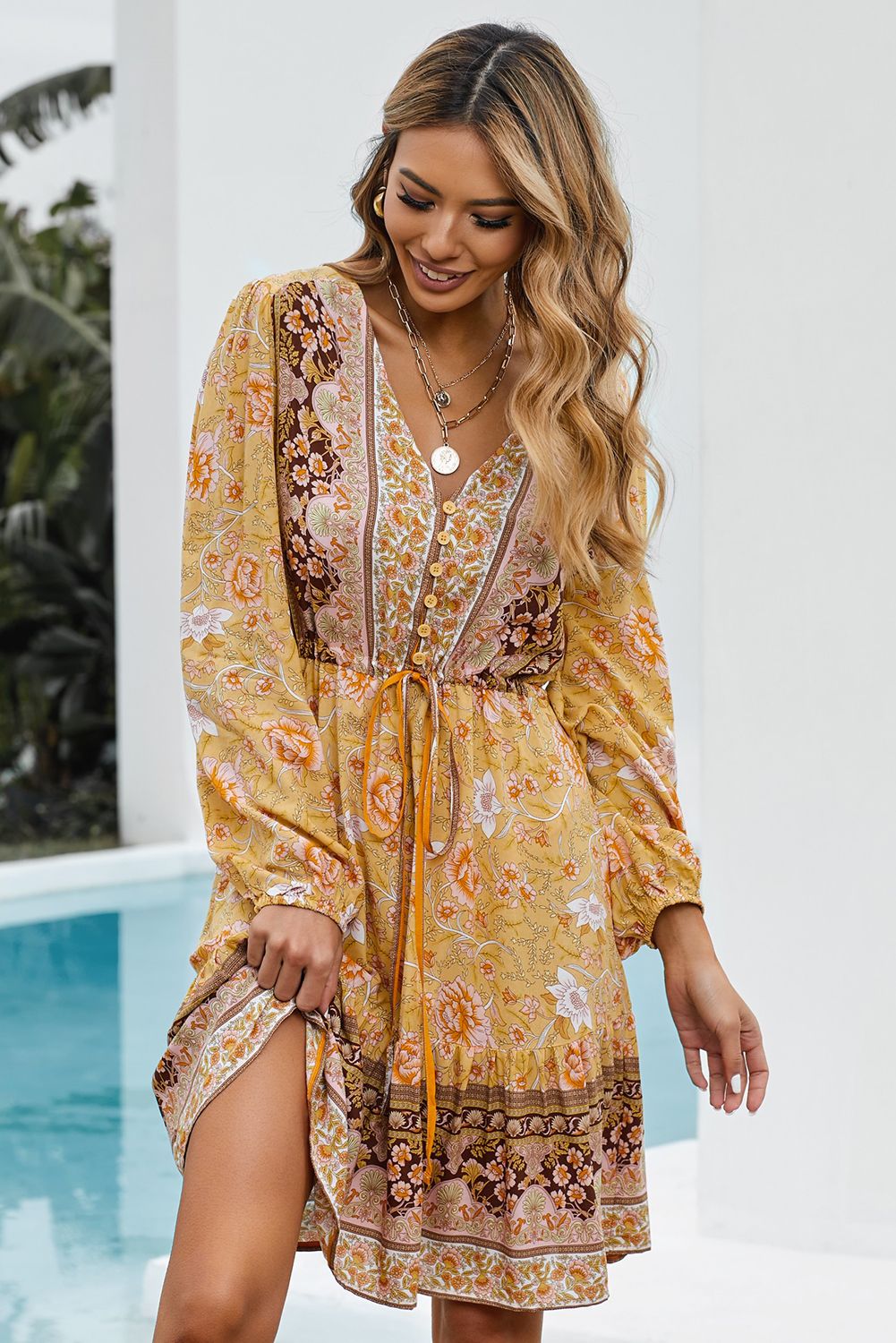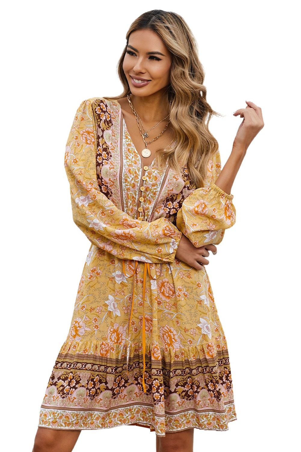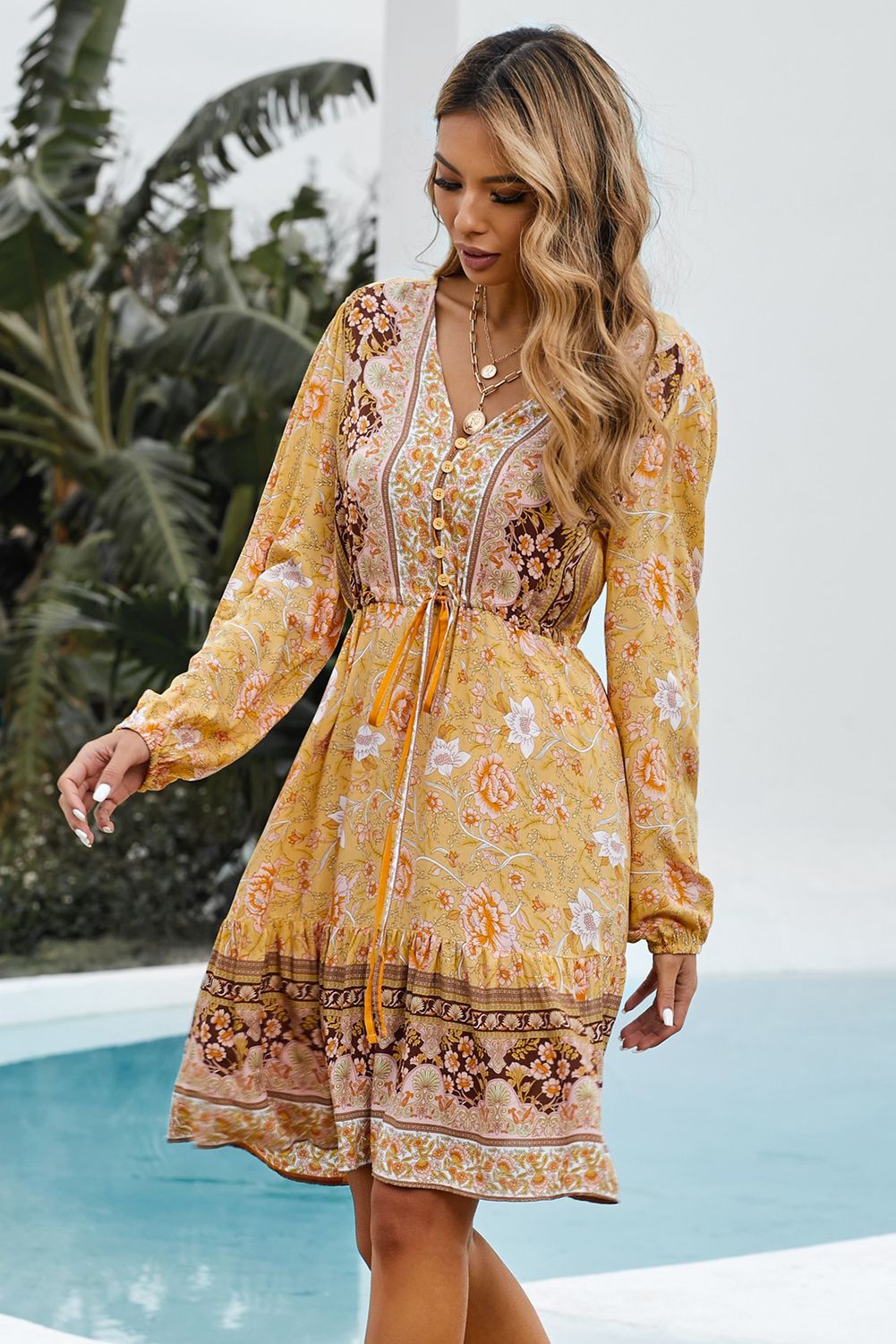 Yellow V-neck Floral Print Long Sleeve Tunic Mini Dress