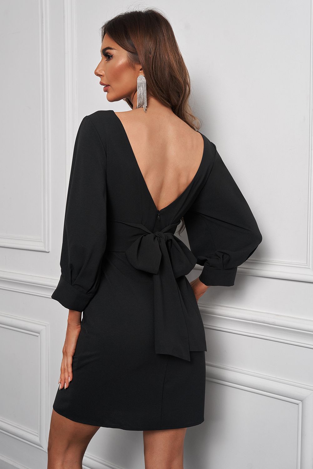 Black Bow Backless 3/4 Sleeve High Waist Mini Dress