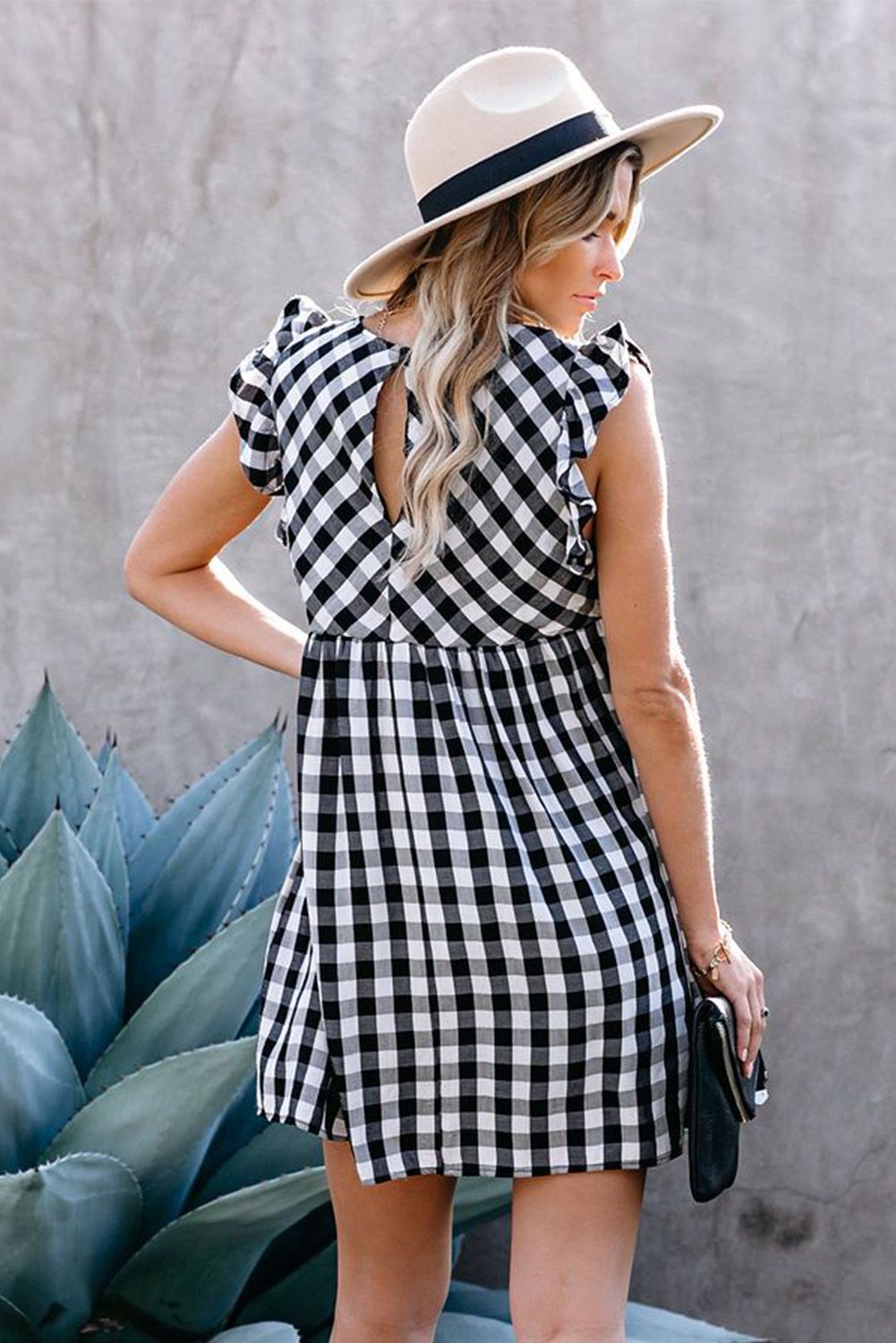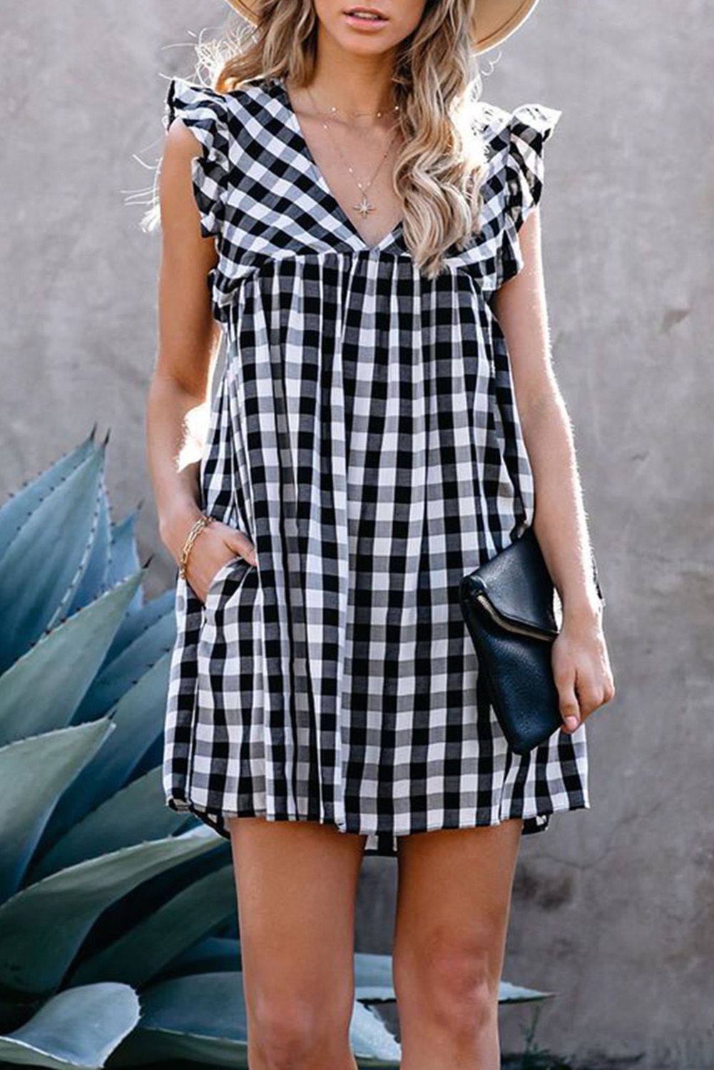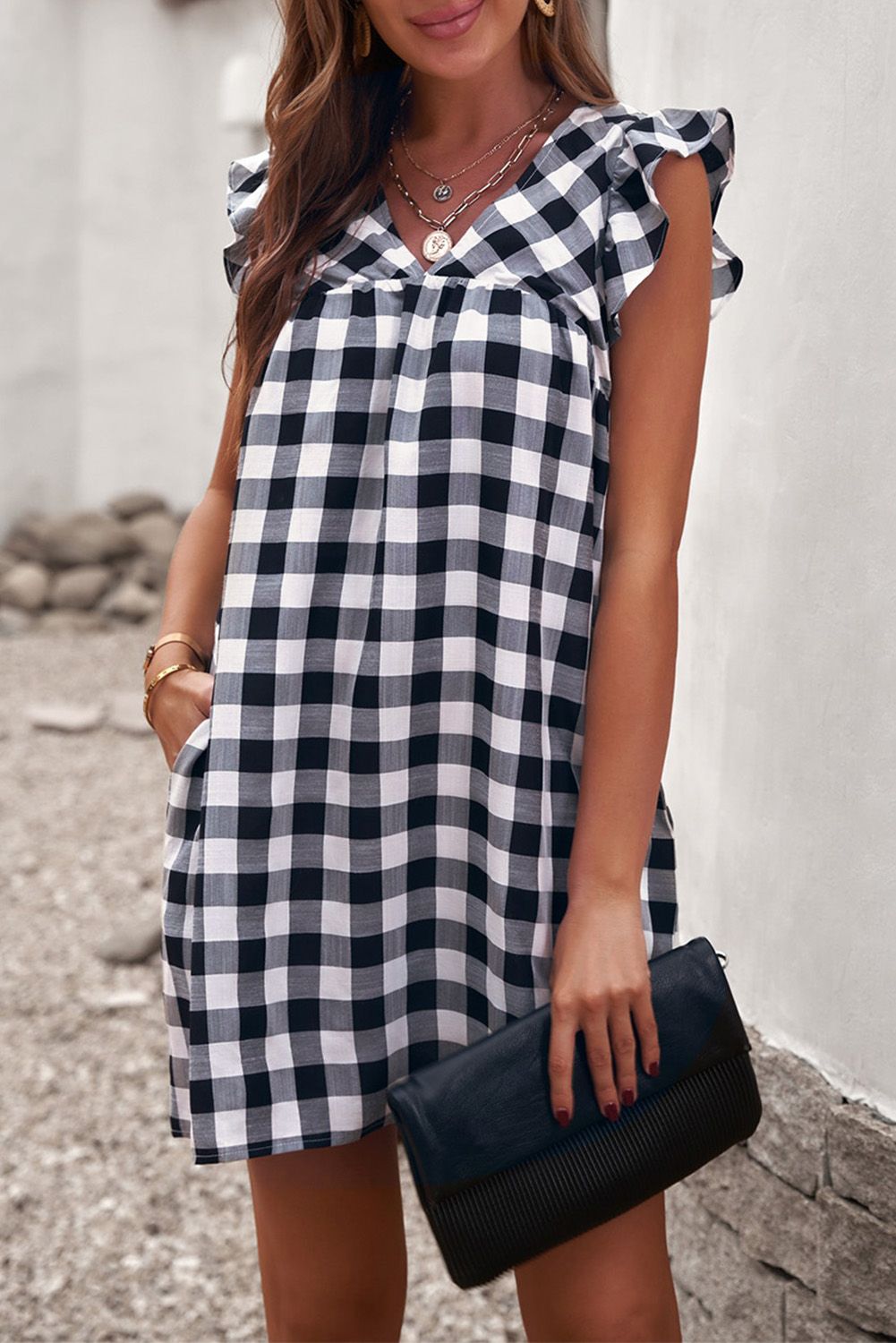 Black Plaid Ruffle V Neck Pocketed Babydoll Mini Dress