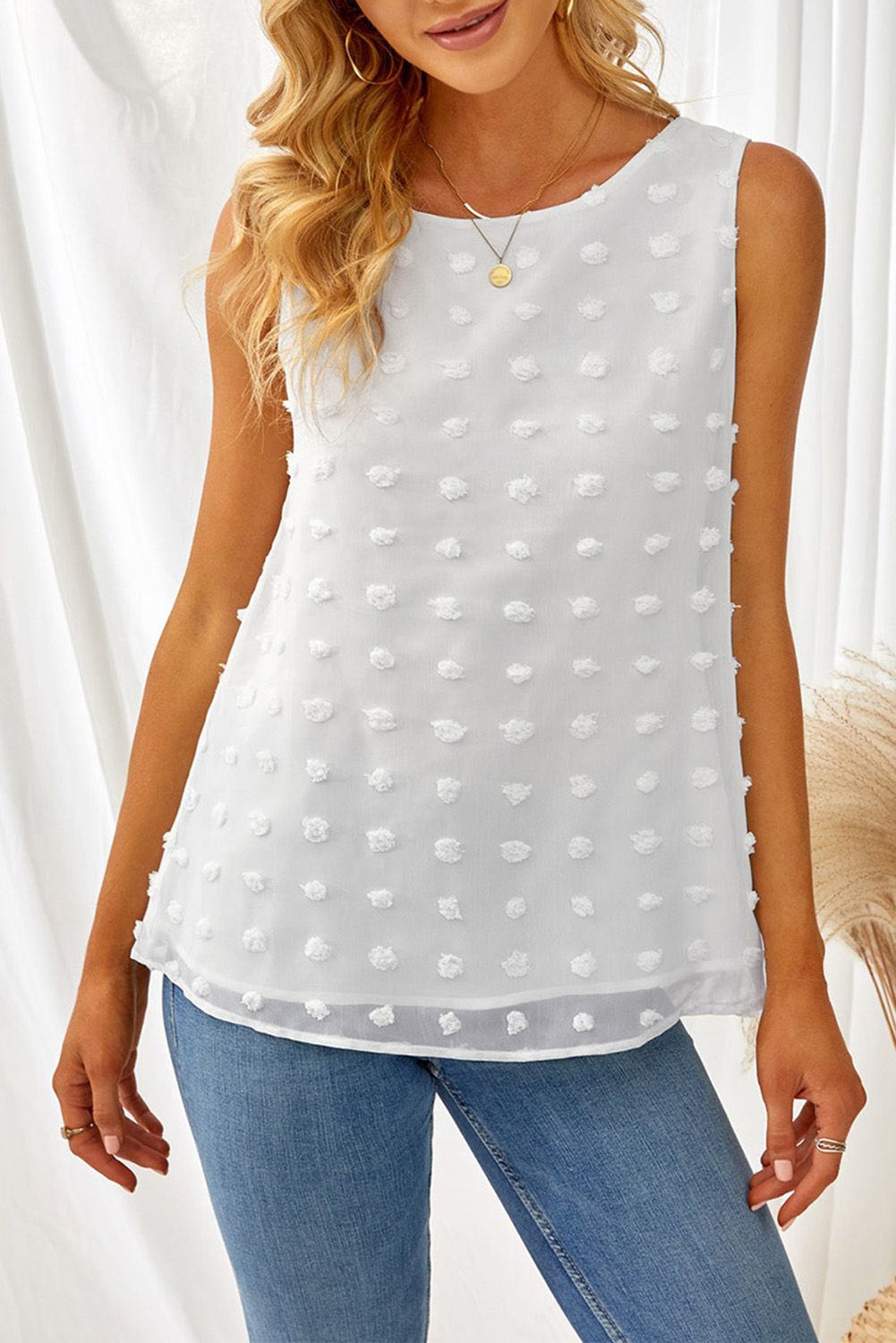 This elegant tank top has a crew neck, unique swiss dot, and pure color is simple but chic