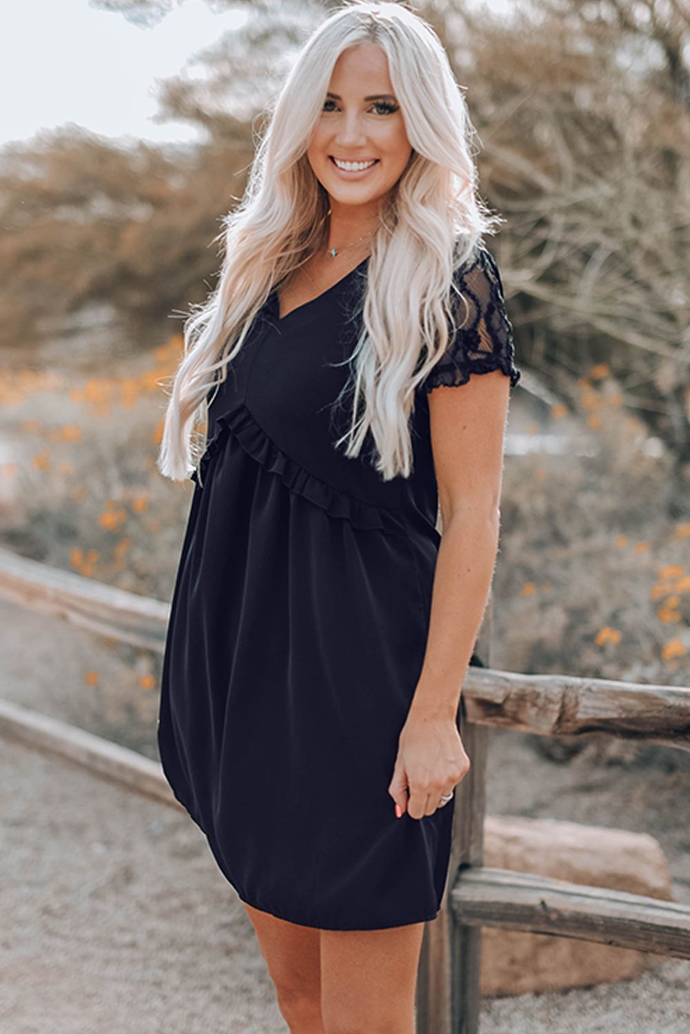 • V neck dress splices with lace sleeves, frilled detail accentuates an empire waistline
